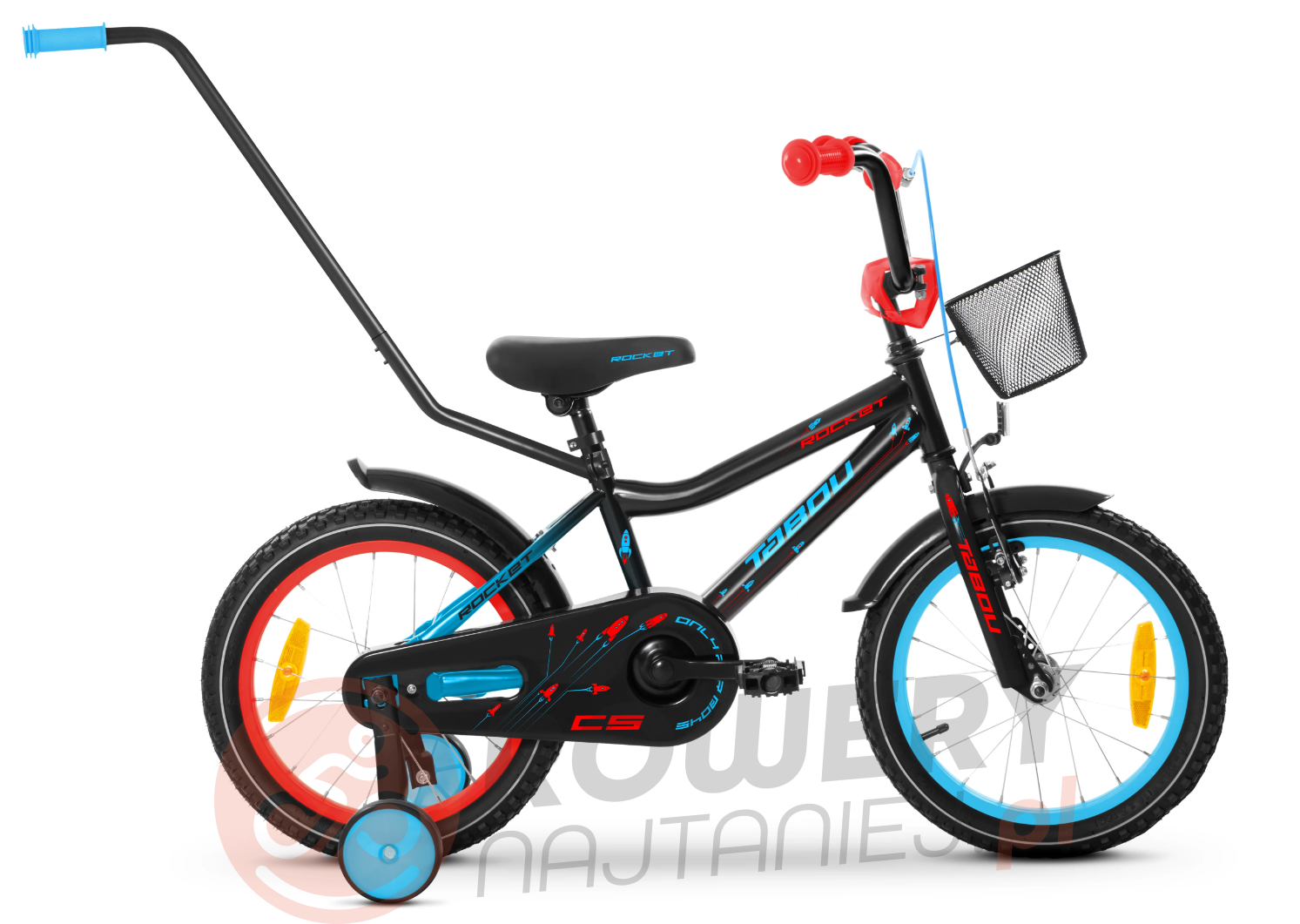 Dodatkowe wyposażenie: UCHWYT DO PROWADZENIA (dostępny w rowerach o rozmiarze kół 12/14/16/18 cali) / KÓŁKA BOCZNE / KOSZYK PLASTIKOWY / DZWONEK-ZABAWKA.